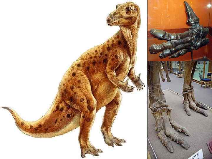 Род Iguanodon K 1 Игуанодонт, также игуанодон (лат. Iguanodon) — род растительноядных птицетазовых динозавров, живших в первой половине мелового периода 140 -120 млн. лет назад на территории современных Европы, Северной Америки, Азии, Африки. Был открыт в 1822 Гидеоном Мантеллом и был вторым получившим название - динозавр, после мегалозавра. Игуанодоны были большими растительноядными динозаврами, переходившими от передвижения на двух ногах к передвижению на четырёх. В передней части челюсти игуанодоны имели клюв, состоящий из кератина, за ним следовали зубы, подобные зубам игуаны, но больших размеров и более частые. Передние конечности были примерно на четверть короче задних, три центральные пальца на них были приспособлены для опоры. На больших пальцах располагались шипы, использовавшиеся предположительно для защиты. В начале XIX века эти шипы считались рогами и помещались палеонтологами на нос животного, истинное их положение было показано позже. «Мизинцы» в противоположность всем остальным пальцам были длинными и гибкими. На задних ногах, приспособленных для ходьбы, но не для бега, было лишь три пальца. Позвоночник и хвост поддерживались окостеневшими сухожилиями.