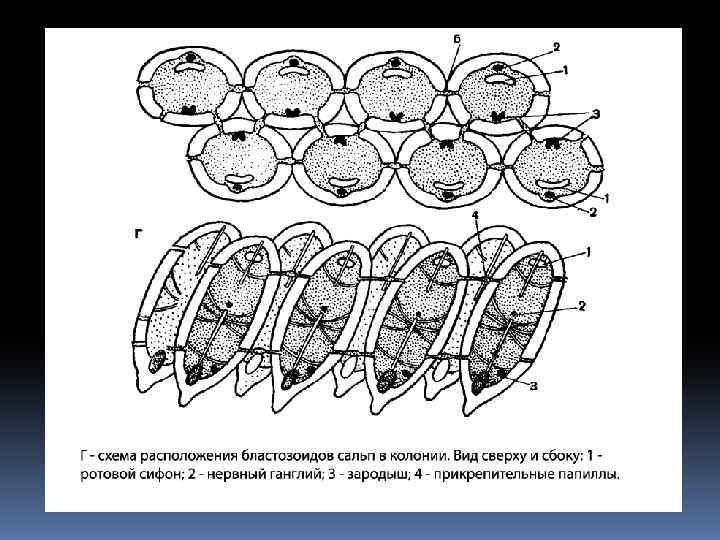 Размножение и развитие. Собственно Сальпы. В теле гермафродитной половой особи — бластозоида — из единственного яйца развивается особь бесполого поколения — оозооид. По окончании развития оозооид покидает материнскую особь и приступает к почкованию новых бластозооидов на специализированном выросте — столоне. Цепочки бластозоодов отрываются от столона и существуют в виде колоний, включающих до несколько сот особей.