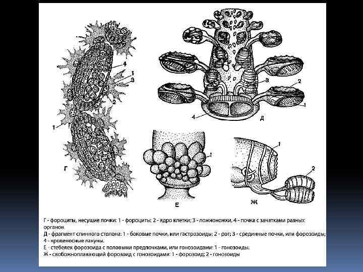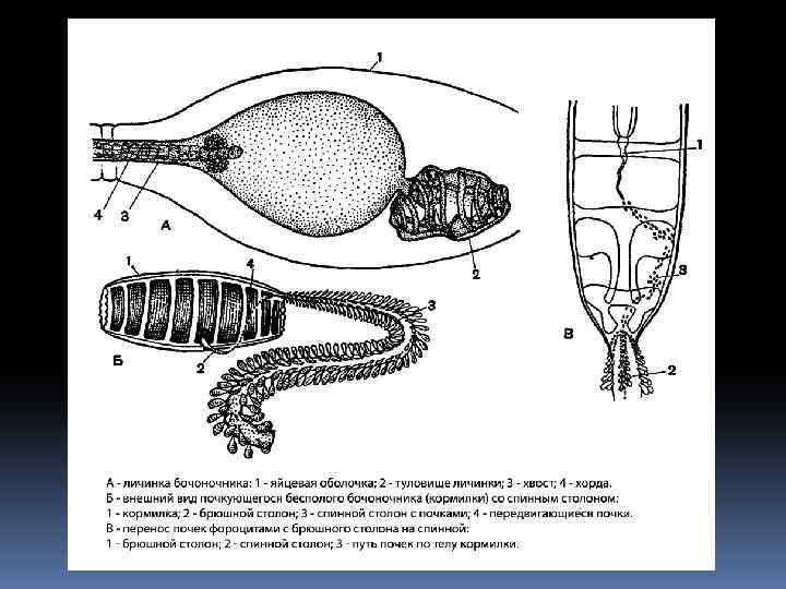Размножение и развитие. Бочоночники. 1. Половая особь развивается на брюшном стебельке форозоида. 2. Половая особь откладывает яйца, и в результате их развития получается бесполая хвостатая (с хордой) личинка. 3. Из личинки непосредственно развивается бесполая кормилка. 4. На спинном столоне кормилки развивается поколение бесполых боковых гастрозоидов. 5. Новое поколение бесполых срединных форозоидов. 6. Появление и развитие на брюшном столоне оторвавшегося от кормилки форозоида половых гонозоидов. 7. Образование половой особи из гонозоида. 8. Откладывание яиц.