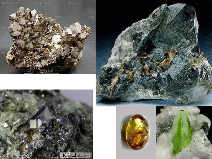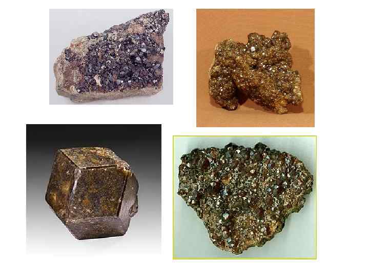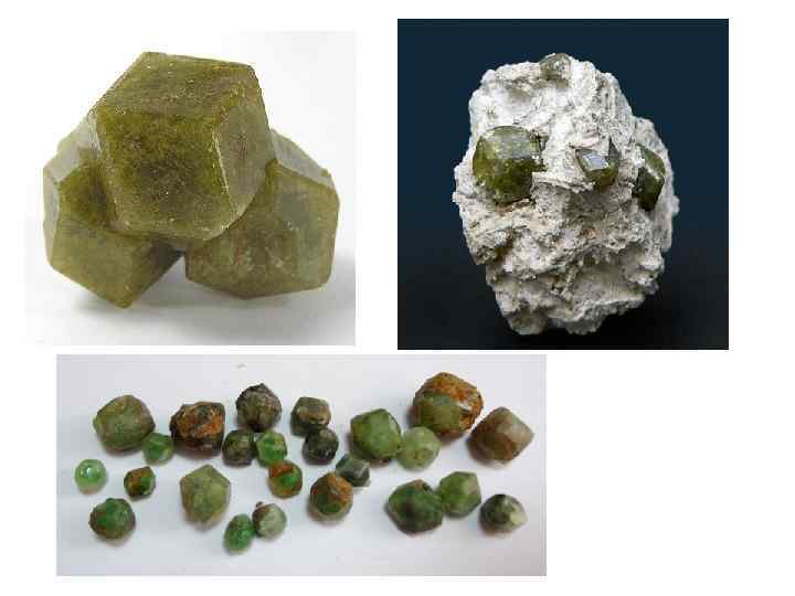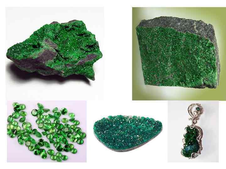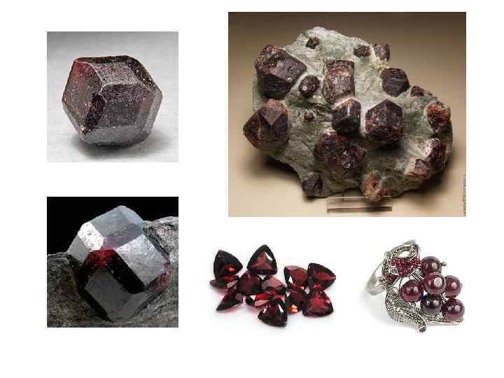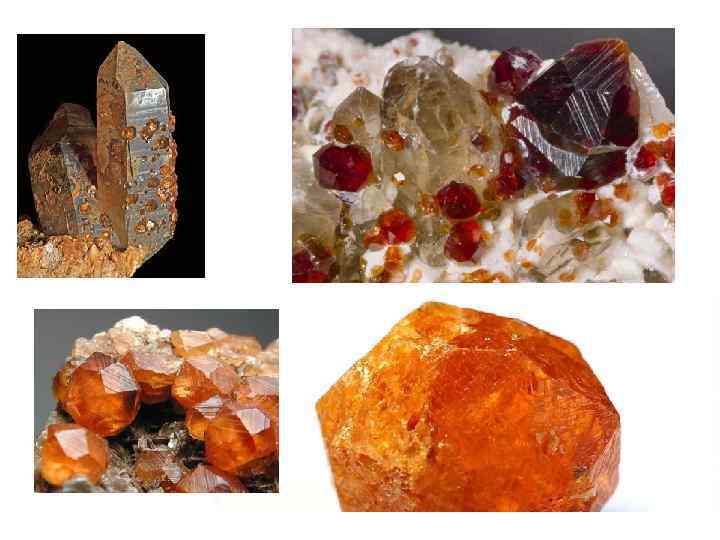 Пиральспиты Пироп Mg 3 Al 2[Si. O 4]3 — от греч. «пиропос» — подобный огню (из-за красного цвета). Цвет тёмнокрасный. Находится в ультраосновных породах, богатых магнием, и продуктах их разрушения. Характерен для алмазоносных пород ЮАР и Якутии. Альмандин Fe 2+3 Al 2[Si. O 4]3 — по названию местности — Аламанда (Малая Азия). Цвет красный, коричневый, фиолетовый. самый распространённый из гранатов. Обычен в кристаллических сланцах и гнейсах. Спессартин Mn 3 Al 2[Si. O 4]3 — по названию Шпессарт (Бавария, Германия). Цвет розовый, красный, желтовато-бурый. Встречается в пегматитах и кристаллических сланцах (Восточная Сибирь, Карелия). Уграндиты Гроссуляр Ca 3 Al 2[Si. O 4]3 — от лат. grossularia — крыжовник (из-за сходства с плодами крыжовника). Цвет светло-зелёный (тсаворит) или зеленовато-бурый. Характерен для скарнов. Андрадит Са 3 Fe 3+2[Si. O 4]3 — в честь бразильского минералога д’Андрада Э. Сильва (1763— 1838). Цвет жёлтый (топазолит), бурый, красный, зеленовато-бурый. Встречается также в скарнах, реже в сланцах и других горных породах. Демантоид — прозрачная разновидность андрадита зелёного цвета (1, 5 % Cr 2 О 3) является драгоценным камнем (россыпи Нижне-Тагильского района, Урал). Меланит — чёрного цвета, содержит Ti. O 2. Уваровит Ca 3 Cr 2[Si. O 4]3 — по фамилии президента Российской академии наук Уварова (1786— 1855). Цвет изумрудно-зелёный. Образует мелкокристаллические корочки в хромите. Редкий. Хорошие образцы известны из Сарановского месторождения хромита на северном Урале. «Гипотетические» гранаты. Гипотетические члены ряда гранатов не встречаются в чистом виде, но могут слагать значительную часть в природных минералах. Кноррингит Mg 3 Cr 2(Si. O 4)3. Кальдерит Mn 3 Fe 2(Si. O 4)3. Скиагит Fе 3 Fe 2(Si. O 4)3. Голдманит Са 3 V 2(Si. O 4)3.