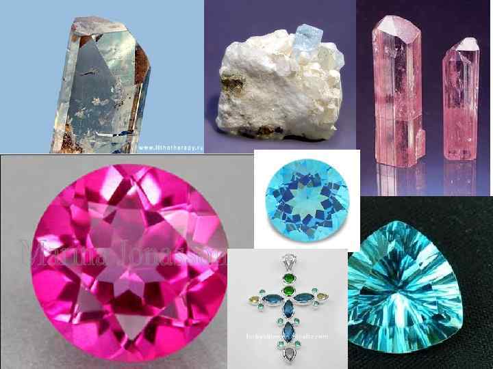 ТОПАЗ - минерал, островной силикат алюминия с фтором. Происхождение названия: Топаз назван по месту первой находки - остров Топазиос (Топазион), сейчас это остров Зебергед, в Красном море или от санскритского "топас" - огонь. Свойства Сингония: Ромбическая Состав (формула): Al 2 Si. O 4 F 2 Цвет: Бесцветный, голубой, жёлтый, серый, белый, зеленоватый, розоватый, красный, фиолетовый, коричневый, полихромный Цвет черты (цвет в порошке): Белый Прозрачность: Прозрачный, Просвечивающий Спайность: Совершенная Излом: Неровный, Раковистый Блеск: Стеклянный Твёрдость: 8 Удельный вес, г/см 3: 3, 49 -3, 6 Особые свойства: Топаз разлагается фосфорной солью. Форма выделения Топаз образует хорошо сформированные призматические и таблитчатые кристаллы, радиально-лучистые и тонкопластинчатые агрегаты (пикнит), сливные очень плотные массы и скрытокристаллические образования.