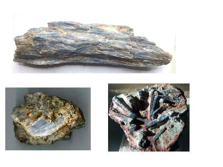 КИАНИТ (ДИСТЕН) - минерал, силикат алюминия. Сингония: Триклинная Состав (формула): Al 2 OSi. O 4, возможна примесь железа, хрома Цвет: Синий разных оттенков, серый, белый, зелёный, тёмно-серый, голубой, желтоватый, розоватый, красно-коричневый, бесцветный Цвет черты (цвет в порошке): Белый Прозрачность: Прозрачный, Просвечивающий Спайность: Совершенная Излом: Неровный, Ступенчатый Блеск: Матовый, Перламутровый, Стеклянный Твёрдость: 4, 5 -7, 5 Удельный вес, г/см 3: 3, 53 -3, 65 Особые свойства: Кианит обладает сильно выраженной анизотропией твёрдости. В кислотах не растворяется. Не радиоактивен. Форма выделения Кианит образует вытянутые, уплощённые, листоватые, часто изогнутые, призматические до таблитчатых кристаллы; плотные волокнистые и радиально-лучистые до игольчатых агрегаты; зернистые и сплошные массы. Иногда кианит образует двойники. Основные диагностические признаки В разных направлениях кристаллы кианита имеют разную твёрдость, меняющуюся от 4, 5 до 7, 5. Сопутствующие минералы Андалузит, альмандин, корунд, рутил, силлиманит, ставролит, цоизит Происхождение Кианит почти всегда присутствует в метаморфических породах, образовавшихся при региональном метаморфизме. Он встречается в кристаллических глинистых сланцах, гнейсах, гранулитах и эклогитах.