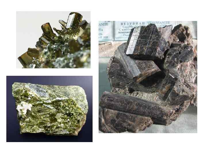ВЕЗУВИАН - минерал, сложный соросиликат группы Везувиана с дополнительными катионами и анионами. Сингония: Тетрагональная Состав (формула): (Ca, Na)19(Al, Mg, Fe)13(Si. O 4)10(Si 2 O 7)4(OH, F, O)10 Цвет: Желтый, зеленый, бесцветный до белого, синий, фиолетовый, синевато-зеленый, розовый, красный, черный, часто окраска зональна. Цвет черты (цвет в порошке): Белый Прозрачность: Прозрачный, Просвечивающий Спайность: Несовершенная Излом: Неровный, Раковистый Блеск: Смолистый, Стеклянный Твёрдость: 6 -7 Удельный вес, г/см 3: 3. 32 -3. 43 -измеренный; 3. 42 -вычисленный Особые свойства: Везувиан хрупок Форма выделения Везувиан образует коротко-, длиннопризматические кристаллы с квадратным сечением; агрегаты зернистые, шестоватые, радиально-лучистые; сплошные, скрытокристаллические массы. Сопутствующие минералы Везувиан встречается в ассоциации с гроссуляром, диопсидом, волластонитом-1 Т, эпидотом, скаполитом, шпинелью, кальцитом. Происхождение Везувиан формируется в скарнах в результате контактового или регионального метаморфизма известняков; также характерен для основных и ультраосновных магматических горных пород, серпентинитов; редко встречается в щелочных изверженных горных породах.