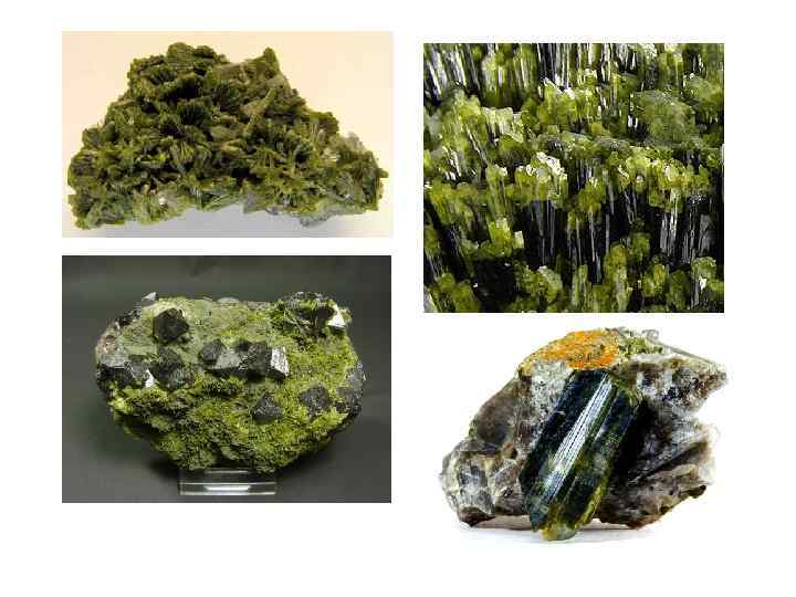 ЭПИДОТ – породообразующий минерал, силикат кальция, железа и алюминия с кислородом и гидроксилом. Сингония: Моноклинная Состав (формула): Ca 2 Fe 3+Al 2(Si 2 O 7)(Si. O 4)O(OH) Цвет: Фисташково-зелёный до бледно-зелёного, желтовато-зелёный, зеленовато-жёлтый, зеленовато-чёрный Цвет черты (цвет в порошке): Белый, сероватый до светло-фисташкового Прозрачность: Прозрачный, Просвечивающий, Непрозрачный Спайность: Совершенная Излом: Неровный Блеск: Перламутровый, Смолистый, Стеклянный Твёрдость: 6 -7 Удельный вес, г/см 3: 3, 38 -3, 49 Особые свойства: Эпидот обладает сильным плеохроизмом. Хрупок. Форма выделения Эпидот образует вытянутые призматические кристаллы; зернистые, радиально-лучистые и параллельношестоватые агрегаты. Сопутствующие минералы Актинолит, амфиболы, кальцит, кварц, плагиоклазы, цеолиты – характерны для фации зелёных сланцев (greenschist facies); амфиболы, везувианит (vesuvianite), волластонит-1 A (wollastonite-1 A), гранаты, пироксены (pyroxenes), скаполит (scapolite), тальк – характерны для эпидот-роговиковой фации (epidote-hornfels facies); глаукофан (glaucophane), гранаты, лоусонит (lawsonite, лавсонит, лосонит), омфацит (omphacite), пумпеллииты (pumpellyite), рибекит (riebeckite) – характерны для фации синих сланцев (blueschist facies). Происхождение Эпидот встречается в известковых скарнах, а также в метаморфических породах, богатых кальцием (средне- и низкотемпературных).