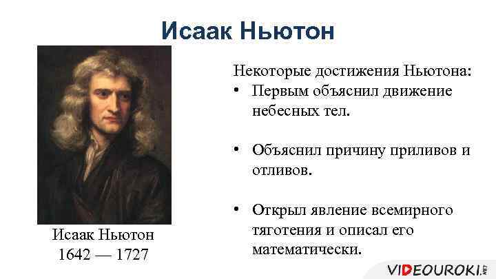 Исаак Ньютон Некоторые достижения Ньютона: • Первым объяснил движение небесных тел. • Объяснил причину приливов и отливов. Исаак Ньютон 1642 — 1727 • Открыл явление всемирного тяготения и описал его математически.