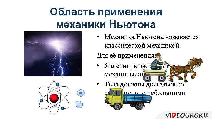Область применения механики Ньютона • Механика Ньютона называется классической механикой. Для её применения: • Явления должны быть механическими. • Тела должны двигаться со сравнительно небольшими скоростями.
