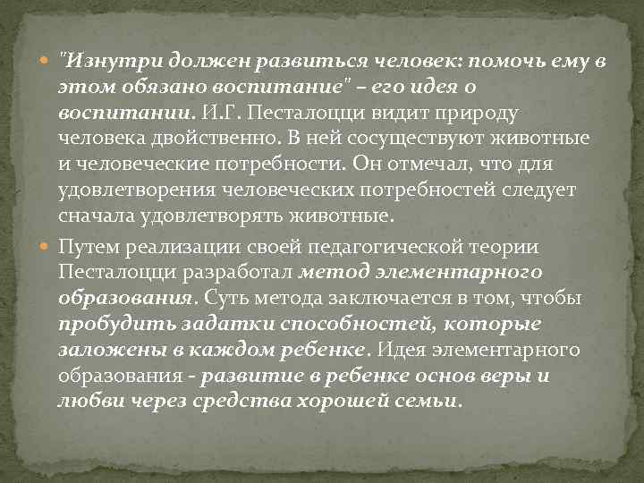 "Изнутри должен развиться человек: помочь ему в этом обязано воспитание" – его идея о воспитании. И. Г. Песталоцци видит природу человека двойственно. В ней сосуществуют животные и человеческие потребности. Он отмечал, что для удовлетворения человеческих потребностей следует сначала удовлетворять животные. Путем реализации своей педагогической теории Песталоцци разработал метод элементарного образования. Суть метода заключается в том, чтобы пробудить задатки способностей, которые заложены в каждом ребенке. Идея элементарного образования - развитие в ребенке основ веры и любви через средства хорошей семьи.