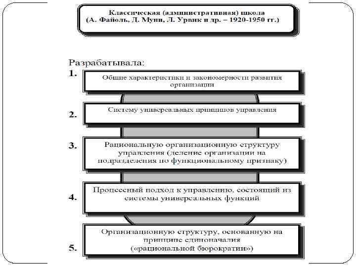 Классическая школа управления ШКОЛА УПРАВЛЕНИЯ КЛАССИЧЕСКАЯ - Концептуальный подход к управлению, появившийся в 1920 -е гг. , основоположником которого является А. Файоль. (Управление организацией: Энциклопедический словарь. М. , 2001)