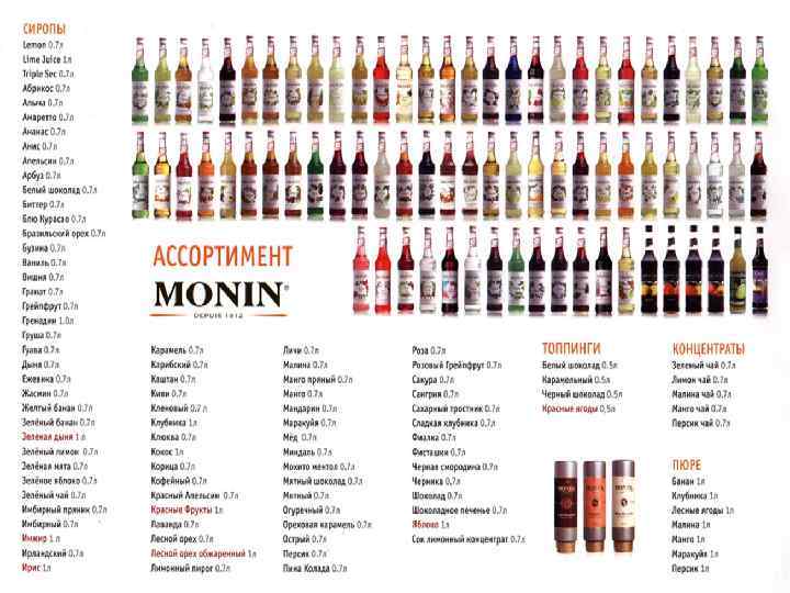 Сиропы • Основные виды сиропов: гранатовый (гренадин), сахарный, кофейный, кокосовый, мятный, миндальный, абрикосовый, ананасовый, клубничный, вишневый, лимонный и т. д. • Сиропы могут заменять ликеры в коктейлях, так как они обладают цветовыми ароматическими и вкусовыми качествами, но в отличии от ликеров не содержат алкоголя, поэтому при замене ликера не сироп необходимо увеличить содержание алкогольной основы.