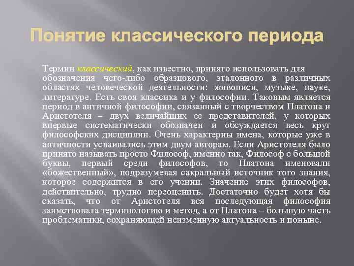 Понятие классического периода Термин классический, как известно, принято использовать для обозначения чего-либо образцового, эталонного в различных областях человеческой деятельности: живописи, музыке, науке, литературе. Есть своя классика и у философии. Таковым является период в античной философии, связанный с творчеством Платона и Аристотеля – двух величайших ее представителей, у которых впервые систематически обозначен и обсуждается весь круг философских дисциплин. Очень характерны имена, которые уже в античности усваивались этим двум авторам. Если Аристотеля было принято называть просто Философ, именно так, Философ с большой буквы, первый среди философов, то Платона именовали «божественный» , подразумевая сакральный источник того знания, которое содержится в его учении. Значение этих философов, действительно, трудно переоценить. Достаточно будет хотя бы сказать, что от Аристотеля вся последующая философия заимствовала терминологию и метод, а от Платона – большую часть проблематики, сохраняющей неизменную актуальность и поныне.