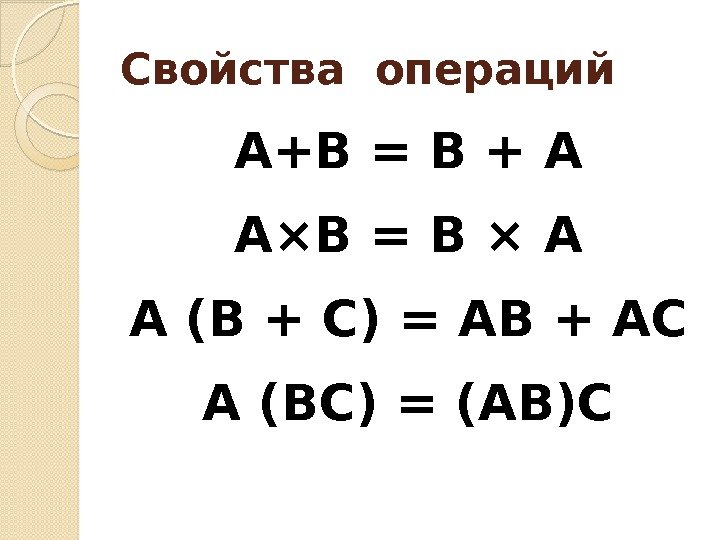 Свойства операций А+В = В + А А×В = В × А А (В + С) = АВ + АС А (ВС) = (АВ)С