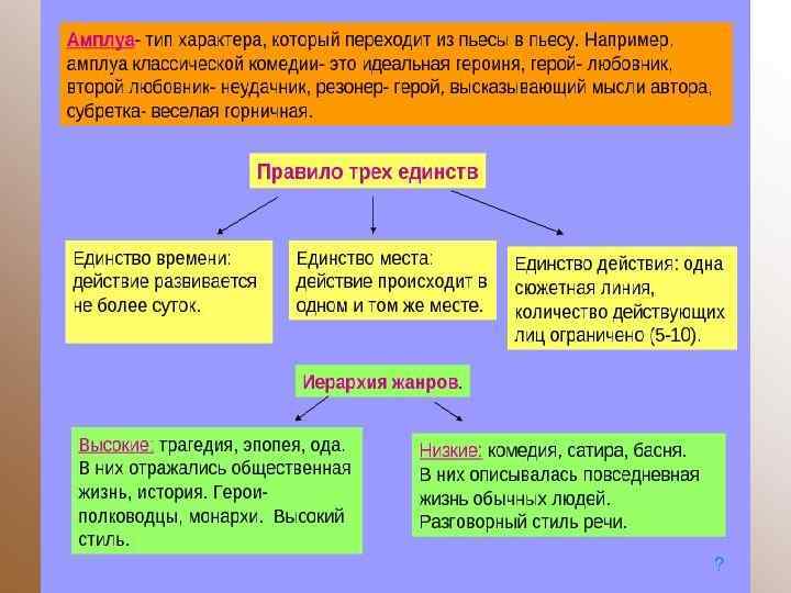 Классицизм Никола Буало. Трактат «Поэтическое искусство» Принципы классицизма в литературе: • Деление на высокие и низкие жанры • Стремление к выражению большого общественного содержания • Герой служит идеям государства, основной конфликт –выбор между общественными и личными интересами • Требование высокого слога • Требование единства времени, действия и места Пьер Корнель, Жак Расин, Ж. Б. Мольер
