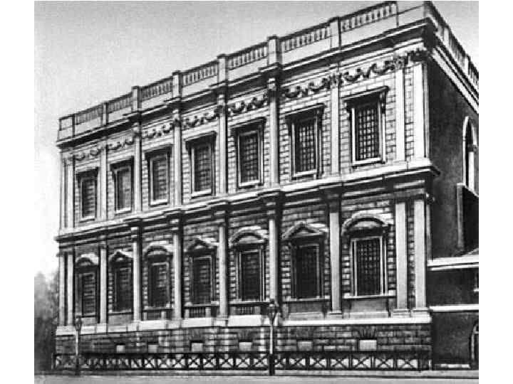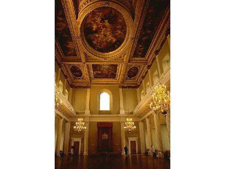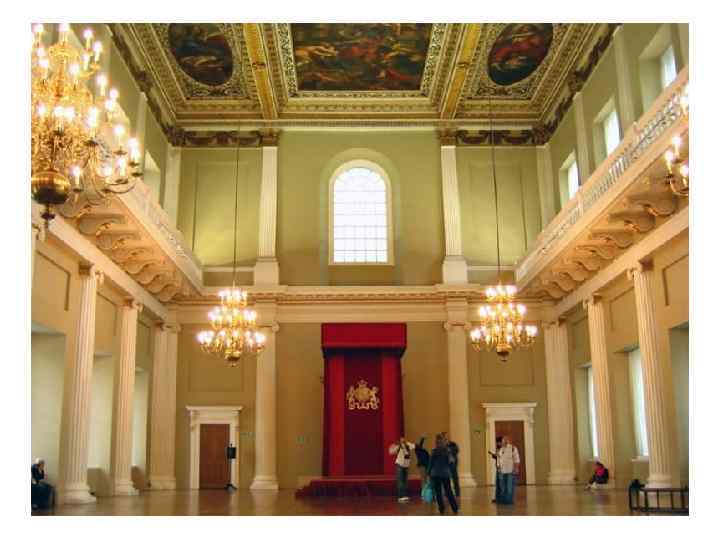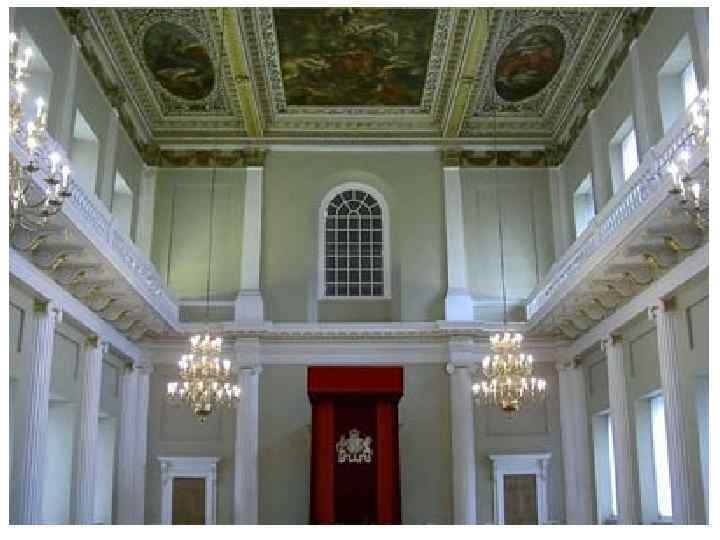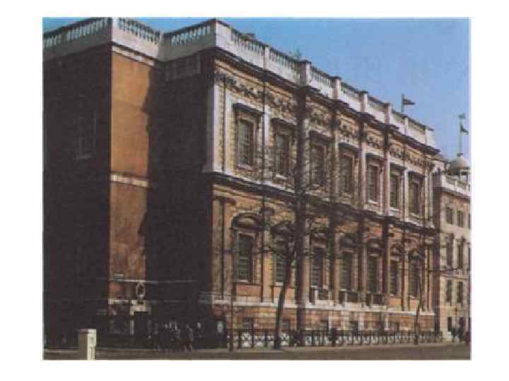 Банкетинг-хаус в Лондоне (Banqueting House) Банкетный зал 1619— 1622 гг. • по внешнему облику значительно ближе к палладианским прототипам. • По благородной торжественности и последовательно проведенной во всей композиции ордерной структуре он не имел предшественников в Англии