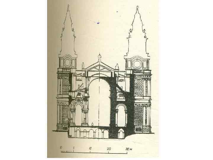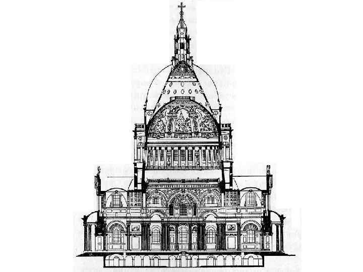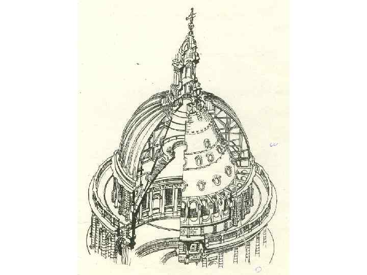 • С архитектурной точки зрения, собор св. Павла – одно из крупнейших купольных зданий христианского мира, стоящее в одном ряду с Флорентийским собором, соборами св. Софии в Константинополе и св. Петра в Риме. • Собор имеет форму латинского креста, его длина 157 м, ширина 31 м; длина трансепта 75 м; общая площадь 155 000 кв. м. • В средокрестии на высоте 30 м заложено основание купола диаметром 34 м, который поднимается на 111 м. • Проектируя купол, Рен применил уникальное решение. Непосредственно над средокрестием он возвел в кирпиче первый купол с круглым 6 -метровым отверстием вверху (окулюсом), полностью соразмерный пропорциям интерьера. • Над первым куполом архитектор соорудил кирпичный конус, служащий опорой для массивного каменного фонаря, вес которого достигает 700 т, • над конусом – второй покрытый свинцовыми листами купол на деревянном каркасе, пропорционально соотнесенный с наружными объемами здания. В основание конуса заложена железная цепь, принимающая на себя боковой распор. Слегка заостренный купол, опирающийся на массивную кольцевую колоннаду, господствует в облике собора.