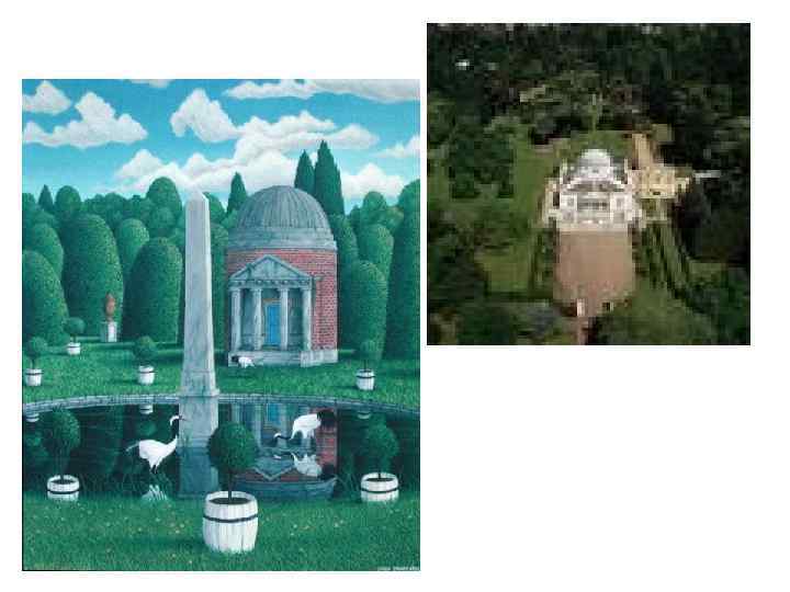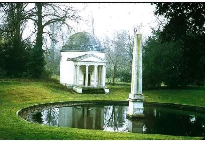 «ландшафтные» парки • Английские палладианцы внесли большой вклад в развитие паркового искусства. На смену модным, геометрически правильным «регулярным» садам пришли «ландшафтные» парки, названные впоследствии «английскими» . Живописные рощи с листвой разного оттенка чередуются с лужайками, естественными водоемами, островами. Дорожки парков не дают открытой перспективы, а за каждым изгибом готовят неожиданный вид. В тени деревьев прячутся статуи, беседки, руины. Главным их создателем в первой половине XVIII века был Уильям Кент(William Kent) • Ландшафтные или пейзажные парки воспринимались как красота разумно подправленной естественной природы, но исправления не должны были быть заметными.