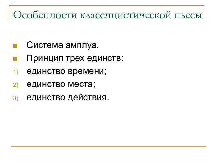 Особенности классицистической пьесы n n 1) 2) 3) Система амплуа. Принцип трех единств: единство времени; единство места; единство действия.