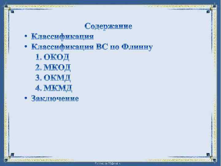 ОКОД — одиночный поток команд и одиночный поток данных. Представителями этого класса являют ся, прежде всего, классические фон неймановские ВМ, где имеется только один поток команд, команды обрабатываются последовательно и каждая команда ини циирует одну операцию с одним потоком данных.