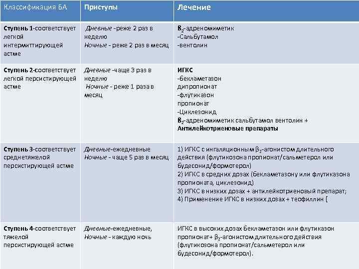 Классификация БА Приступы Лечение Ступень 1 -соответствует Дневные -реже 2 раз в легкой неделю интермиттирующей Ночные - реже 2 раз в месяц астме ß 2 -адреномиметик -Сальбутамол -вентолин Ступень 2 -соответствует Дневные -чаще 3 раз в легкой персистирующей неделю астме Ночные - реже 1 раза в месяц ИГКС -бекламетазон дипропионат -флутиказон пропионат -Циклезонид ß 2 -адреномиметик сальбутамол вентолин + Антилейкотриеновые препараты Ступень 3 -соответствует Дневные-ежедневные среднетяжелой Ночные - чаще 5 раз в месяц персистирующей астме 1) ИГКС с ингаляционным β 2 -агонистом длительного действия (флутикозона пропионат/сальметерол или будесонид/формотерол) 2) ИГКС в средних дозах (бекламетазону или флутиказона пропионата, циклезонид) 3) ИГКС в низких дозах + антилейкотриеновый препарат; 4) Применение ИГКС в низких дозах + теофиллин [ Ступень 4 -соответствует Дневные-ежедневные, тяжелой Ночные - каждую ночь персистирующей астме ИГКС в высоких дозах бекламетазон или флутиказон пропионат+ β 2 -агонистом длительного действия (флутикозона пропионат/сальметерол или будесонид/формотерол).
