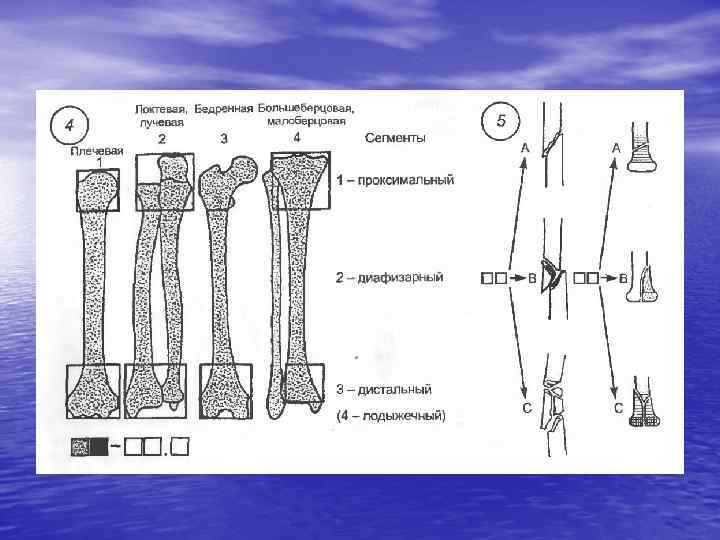 1. Каждая кость или группа костей имеет 2. 3. свое цифровое обозначение (плечевая кость-1, кости предплечья-2, бедро-3, голень-4, позвоночный столб-5, таз-6, кисть-7, стопа-8). Каждая кость имеет три сегмента, которые так же обозначаются цифрами. Каждый сегмент делится на три типа переломов, обозначаемых по возрастанию тяжести и обозначается буквами.