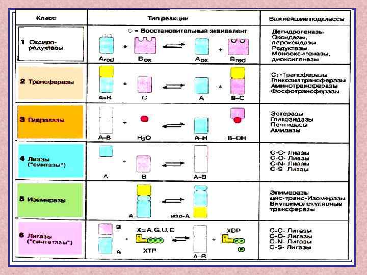 Классификация ферментов Кла Тип катализируемой сс реакции фермента ы Подкласс ТДФ, ПФ, кобамидные 4. 1. С=С 4. 2. С=О 4. 3. C=N 4. 4. С=S Взаимопревращение оптических и геометрических изомеров кобамидные 5. 1. Рацемазы и эпимеразы 5. 2. Цис-трансизомеразы 5. 3. Внутримолекулярные оксидоредуктазы 5. 4. Внутримолекулярные Трансферазы 5. 5. Внутримолекулярные лиазы Синтез органических веществ за счёт образования новых связей СС, СN, СS с использованием АТФ HSKo. А, АТФ, биотин 6. 1. С=О 6. 2. С-S 6. . 3. C-N 6. 4. С-С 6. 5. Фосфоэфирные связи Лиаз Негидролитический разрыв связи СС, СN, СS Изом еразы Ли газы Кофермент