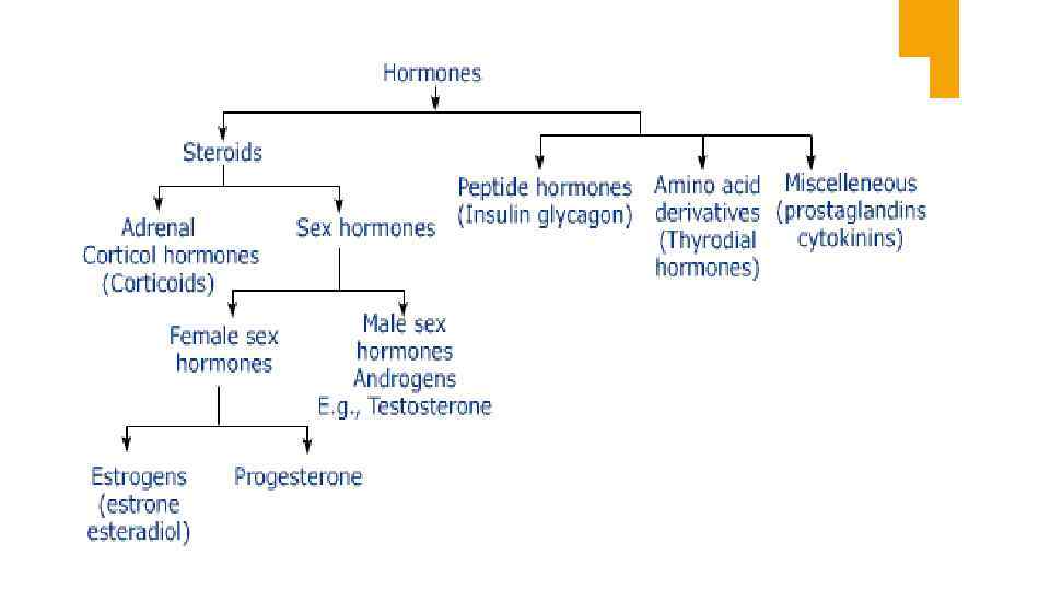 Классификация гормонов по химическому строению: Пептиды Производные аминокислот гормоны гипоталамуса, гипофиза, паращитовидной и поджелудочной желез, кальцитонин гормоны щитовидной железы, эпифиза Кортиколиберин Кальцитонин Тиреолиберин Соматостатин антидиуретический гормон (АДГ, вазопрессин), окситоцин, кальцитонин, паратгормон, инсулин, глюкагон Тироксин (Т 4) Кальцитрин Адреналин, норадреналин, тироксин, трийодтиронин. Стероидные соединения гормоны надпочечников и половые гормоны Кортизол, альдостерон, эстрадиол, прогестерон, тестостерон, кальцитриол