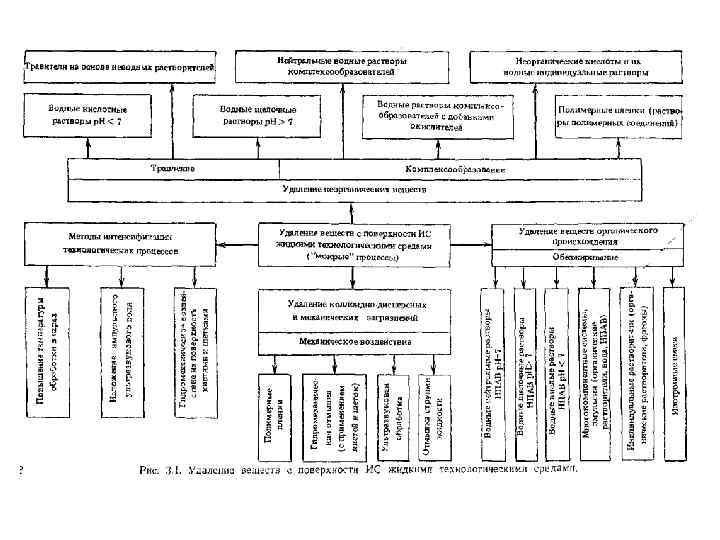 Органические загрязнения создают неоднородную поверхность для травителей, так как растворение чистых и загрязненных областей происходит с различными скоростями. Кроме того, остатки органи ческих загрязнений вызывают образование нелетучих соединений (на пример, карбидов) во время высокотемпературных процессов, что при водит к резкому ухудшению качества (например, при термическом окислении возможно образование кристаллитов в пленке Si 02, а при наращивании эпитаксиальных слоев — образование объемных струк турных дефектов). Количество адсорбированных загрязнений определяет в значитель ной мере адгезию нанесенных пленок, стабильность их механических и электрофизических характеристик в процессе эксплуатации и хранения ИС. Высокая чистота поверхности подложки является необходимым условием для получения на ее поверхности пленок с воспроизводимыми свойствами. Основные процессы удаления вещества с поверхности твердой фа зы жидкими технологическими средами приведены на рис. 3. 1. При разработке и использовании процессов удаления загрязнений необходимо учитывать основные принципы очистки: технологический процесс очистки должен состоять из ряда последовательных операций, каждая из которых предназначена для удаления одного или несколь ких видов загрязнений; для очистки поверхности необходимо приме нять реагенты, продукты взаимодействия которых с поверхностными загрязнениями легко удаляются на дальнейших этапах; во внимание должны приниматься экологические особенности (т. е. воздействие на окружающую среду) и экономические факторы.