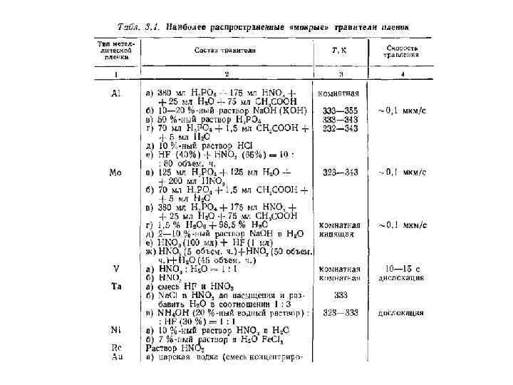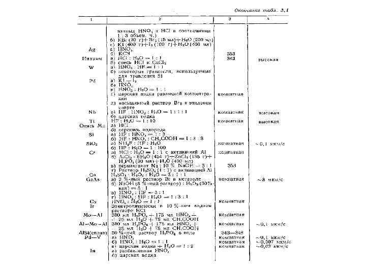 Описанные методы широко применяются в производстве полупро водниковых приборов и ИС, они достаточно эффективны, позволяют получать воспроизводимые результаты и обеспечивают высокие тех нико экономические показатели. В заключение рассмотрим конкретный пример подготовки поверх ности подложек перед термическим окислением. Кипячение в водном растворе НПАВ приводит к интенсивному пе ремешиванию, предотвращает осаждение на очищаемую поверхность загрязнений, переведенных в водную фазу. Гидромеханическая обработ ка кистями в среде горячего водного раствора НПАВ обеспечивает эффективное удаление с поверхности органических загрязнений, кол лоидно дисперсных и механических частиц. В процессе очистки в кипящем перекисно аммиачном растворе про исходит десорбция неорганических загрязнений, перевод ионов метал лов в высшие степени окисления и образование устойчивых комплекс ных соединений с Н 202 и NH 3. Такая обработка обеспечивает малые обратные токи р—n переходов(0, 02— 0, 03 мк. А при 75 В) в кремние вых структурах, исключает применение дорогих и остродефицитных реактивов, отличается простотой и позволяет автоматизировать тех нологический процесс. Широкое распространение локального удаления пленок получили «мокрые» процессы. В табл. 3. 1 приведены некоторые наиболее извест ные «мокрые» травители. При выборе травителя необходимо учитывать клин травления, неравномерность края травления, скорость и техно логичность процесса.