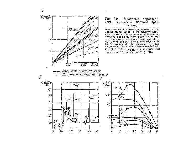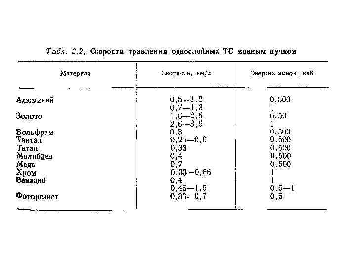 Ионное травление обеспечивает разрешающую способность фоторезистивных масок, получение элементов с вертикальными стенками и большим отношением глубины к ширине. Скорость травления пленок в первом приближении пропорциональна произведению плотности потока падающих ионов и коэффициента распыления материала. Плот ность потока обусловлена в основном конструкцией источника и степенью ионизации рабочего газа. Коэффициент распыления S определяется как число атомов, выбитых из подложки, на один падающий ион. В свою очередь на коэффициент распыления влияет природа мишени (пленки), величина ускоряющего напряжения, энергия ионов, тип газа и угол падения. На рис. 3. 2, а приведены коэффициенты распыления материалов с различным атомным весом в зависимости от энергии ионов. Исходя из зависимостей рис. 3. 2, б, следует, что скорость распыления переходных металлов, вероятно, связана со степенью за полнения электронных оболочек 3 d, 4 d, 5 d. Как было показано в § 1. 4, скорость травления практически всех материалов зависит от угла падения ионов на обрабатываемую поверхность (рис. 3. 2, в). Оптимальным углом наклона луча следует считать 30— 60°. В табл. 3. 2 приведены скорости травления различных пленок ионами, нормально падающими на поверхность. К недостаткам метода ионного травления относятся: нагрев подложек; гранение маски из фоторезиста, приводящее к более быстрому распылению краев маски из за неодинаковых углов падения ионов; образование канавок вблизи маски; воздействие заряженных частиц на диэлектрические слои полупроводниковых структур, способных вызвать диэлектрический пробой при j ≈1015 ионов/см 2 (поверхностные состояния можно устранить с помощью отжига в среде водорода или азота при t≤ 773 К). Однако при ионном травлении лучше нейтра лизовать положительный заряд на подложках, например с помощью нити накаливания, эмиттирующей электроны.