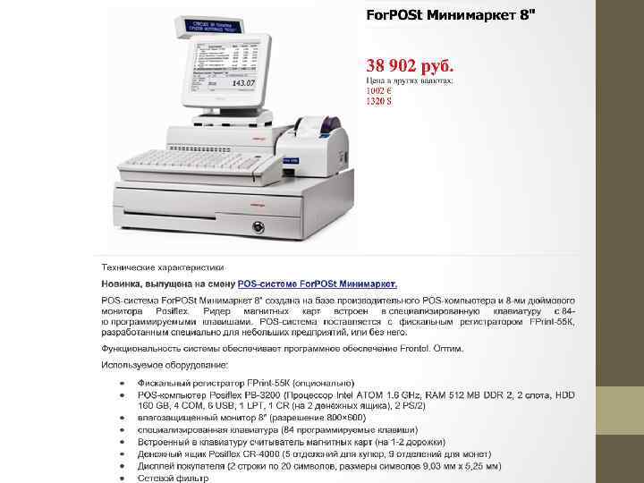 Автономная контрольно-кассовая машина контрольно кассовая машина, расширение функциональных возможностей которой может достигаться только за счет подключения дополнительных устройств ввода вывода, управляемых ККМ по размещенным в ней программам. К автономным ККМ относятся и портативные ККМ, имеющие возможность работы без постоянного подключения к электросети. Пассивная системная контрольно-кассовая машина контрольно кассовая машина, имеющая возможность работать в компьютерно кассовой системе, но не имеющая возможности управлять работой этой системы. Пассивная системная ККМ может использоваться как автономная ККМ. Активная системная контрольно-кассовая машина контрольно кассовая машина (ККМ), имеющая возможность работать в компьютерно кассовой системе, управляя при этом работой системы. К активной системой ККМ относится также POS терминал ККМ с фискальной памятью, обладающая возможностями персонального компьютера по вводу выводу, хранению, обработке и отображению информации. POS системы это программно аппаратные комплексы, включающие в себя фискальный регистратор, компьютер, монитор, клавиатуру, табло для покупателей, считыватели магнитных карт. Активная системная ККМ может использоваться как пассивная системная или автономная ККМ. Фискальный регистратор (ФР) это контрольно кассовая машина, способная работать только в составе компьютерно кассовой системы, получая данные через канал связи.
