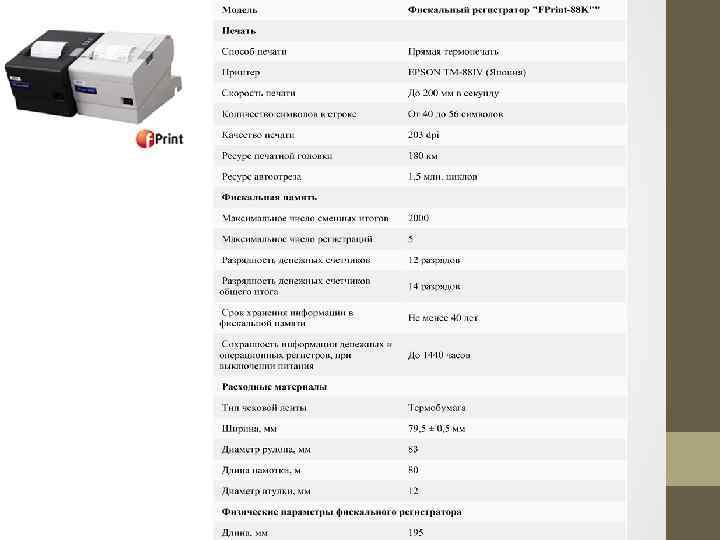 Модель Контрольно-кассовый аппарат Штрих-Мини-К ККМ Разрядность сумм 8 Количество секций 30 Количество кассиров 8 Количество программируемых налоговых ставок 4 Количество типов оплаты 4 Типы штрих кодов Печать Тип печати термопечать Печатающий механизм CITIZEN MLT 288 Скорость печати, строк в секунду 8 Расходные материалы Тип термобумага Ширина рулона, мм 57 Диаметр рулона, мм 60 Фискальная память Количество перерегистраций 5 Количество активаций ЭКЛЗ 20 Количество сменных итогов 2000 Дисплей Тип жидкокристаллический, черно белый Разрядность [кассир/покупатель] 2 х 16 / 10 Клавиатура Число клавиш 33 Тип клавиатуры кнопочная Питание, В / Гц 130 270 / 50 Аккумулятор Емкость, В / Ач 6 / 1, 3 Зарядка от сети в комплекте Интерфейс 4 x RS 485 Физические параметры ККМ Размеры, мм 320 x 226 x 92 Вес, кг 1, 7 Цвет Условия эксплуатации Диапазон рабочих температур, °С +10 / + 40 Производитель Страна Россия Компания ЗАО "Штрих М" Подключаемые устройства ПК (RS 485), весы, сканер, денежный ящик • Благодаря реализации в ККМ нового протокола "ШТРИХ М: Особенности Протокол 2", она может быть сопряжена с интеллектуальными расширителями памяти "Memo. Plus. Ethernet", "Memo. Plus. Lite" и программным продуктом "ШТРИХ М: Сервер ККМ". • 4 вида оплаты наличный, кредит, тара, предоплата; Скидки и надбавки введенные с клавиатуры, запрограммированные, даваемые подключением программного продукта «Штрих М: Сервер ККМ» .