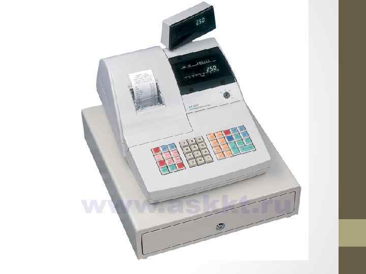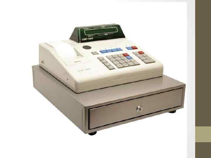Контрольно-кассовая машина (ККМ) — предназначена для регистрации приобретения товара и печати кассового чека. Контрольно кассовая машина (ККМ) — это инструмент контроля со стороны государства за налично денежным оборотом, полнотой и своевременностью учета предприятиями наличной выручки. Кассовый аппарат — электронный прибор, снабжённый устройством для печатания кассового чека. У этого прибора есть экран, клавиатура и печатающее устройство, которое печатает на специальной бумажной ленте. Контрольно кассовые машины обеспечивают наглядность, простоту и правильность расчета, контроль за ведением расчетно кассовых операций, точность учета денежных поступлений, повышают производительность труда контролёров кассиров, снижают до минимума возможность ошибок при расчетах, предоставляют сведения об объемах продаж товаров и о количестве обслуженных покупателей по часам рабочей смены. При этом значительно ускоряется процесс расчетов с покупателями. ФЕДЕРАЛЬНЫЙ ЗАКОН от 22. 05. 03 контрольно кассовой техники наличных денежных расчетов с использованием платежных карт» n 54 фз при и «О (или) применении осуществлении расчетов Постановление Правительства РФ от 23. 07. 2007 N 470 «Положение о регистрации и применении контрольно кассовой техники, используемой организациями и индивидуальными предпринимателями» . 5