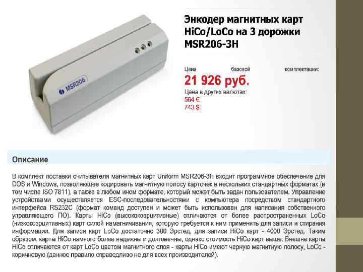 Считыватель магнитных карт – это необходимое оборудование для получения информации с карточек разного типа: от дисконтных карт с информацией о покупателе, составе листа его покупок и величине скидки до идентификационных карточек с данными о сотруднике компании, который пытается получить доступ в помещение и т. д. Такой ридер может также применяться для считывания данных с банковских карточек, принимаемых к оплате в магазинах, предприятиях общественного питания, пунктах оплаты за те или иные услуги и т. д. Считыватели магнитных карт могут применяться и в качестве отдельного устройства, так и быть встроенными в определенные модели мониторов кассира, программируемых клавиатур и т. д. , т. . е различной POS периферии. В зависимости от характеристик той или иной модели ридер работать с теми или иными видами карт или позволять принимать любые типы карт. При этом информация с карты передается в программное обеспечение, установленное в POS системе, или напрямую в товароучетную программу, используемую для ведения точного учета товаров и регистрации всех операций с финансовыми потоками. Считыватель магнитных карт дает возможность быстро считывать всю необходимую информацию, записанную на карте, и обрабатывать ее в применяемой программе для автоматизации контроля торговых операций, таким образом, обеспечивая быстрый доступ к информации. Компания БИТ предлагает оборудование ведущих производителей – компаний Cipher Lab, Zebex и Posiflex.