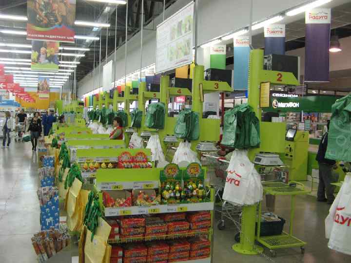 Кассовая линейка в торговом зале заменена терминалами самообслуживания Self checkout на базе моделей Fujitsu TP X. Система самообслуживания включает в свой состав станцию сканирования товаров и станцию оплаты. Для сканирования товаров в магазине установлено 20 станций. Оплата производится покупателем самостоятельно через аппараты для приема купюр, и их установлено больше — 28 штук, потому что человек может замешкаться, подбирая купюры и забирая сдачу. Линия касс отделена от линии сканирования. Все решение построено на базе оборудования компании Fujitsu. Система безопасности оборудована с использованием решений компании Wanzl Mawy. Расчет покупателя за покупки происходит по следующей схеме. Покупатель с тележкой продуктов подходит к станции сканирования. Сотрудник магазина — теперь появился термин «сканировщик» — поочередно сканирует штрихкод товара, перекладывая товар в свободную точно такую же тележку. Поскольку сканировщик выполняет только одну операцию, процесс происходит очень быстро — всего несколько минут. В результате формируется талон со штрихкодом, который автоматически распечатывается на фискальном принтере. На талоне указывается вся информация о приобретаемом товаре: название, его количество и сумма, а также печатается штрихкод. Талон выдается покупателю, и тот передвигается в зону оплаты. Здесь происходит расчет покупателя за приобретаемые товары. Покупателю необходимо просканировать ранее полученный талон со штрихкодом. На экране высвечивается сумма покупки. Деньги вставляются в устройство для принятия банкнот и монет, аппарат выдает сдачу и фискальный чек, на котором стоит штрихкод. Этот чек является пропуском через систему безопасности: покупатель перемещается к проходной системе, где встроено сканирующее устройство. Просканировав полученный фискальный чек, система проверяет, где и когда была совершена покупка, автоматически открывает барьер, и покупатель может выйти из магазина. Система безопасности дополнена видеонаблюдением и сотрудниками охраны. Общая экономия времени на обслуживание клиентов составила 40%. Разделение линий сканирования и оплаты в сравнении с обычными кассами дает экономию времени: сканирования — на 15– 20%, оплаты — на 20– 30%.