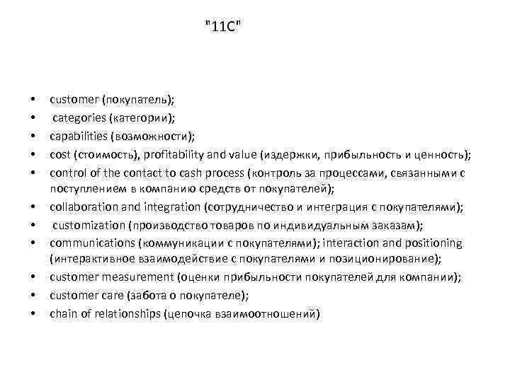 "11 С" • • • customer (покупатель); categories (категории); capabilities (возможности); cost (стоимость), profitability and value (издержки, прибыльность и ценность); control of the contact to cash process (контроль за процессами, связанными с поступлением в компанию средств от покупателей); collaboration and integration (сотрудничество и интеграция с покупателями); customization (производство товаров по индивидуальным заказам); communications (коммуникации с покупателями); interaction and positioning (интерактивное взаимодействие с покупателями и позиционирование); customer measurement (оценки прибыльности покупателей для компании); customer care (забота о покупателе); chain of relationships (цепочка взаимоотношений)