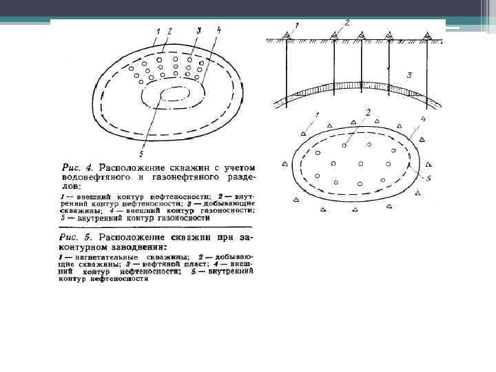 1. Системы разработки при отсутствии воздействия на пласты. Если предполагается, что нефтяное месторождение будетразрабатываться в основной период при режиме растворенногогаза, для которого характерно незначительное перемещение водонефтяного раздела, т. е. при слабой активности законтурных вод, то применяют равномерное, геометрически правильноерасположение скважин по четырехточечной (рис. 2) или трехточечной (рис. 3) сетке. В тех же случаях, когда предполагается определенное перемещение водонефтяного и газонефтяногоразделов, скважины располагают с учетом положения этих разделов (рис. 4). Параметр плотности сетки скважин Sс, вообще говоря, может изменяться в очень широких пределах для систем разработки без воздействия на пласт. Так, при разработке месторождений сверхвязких нефтей (вязкостью в несколько тысяч 10 -3 Па-с) он может составлять 1— 2*104 м 2/скв.