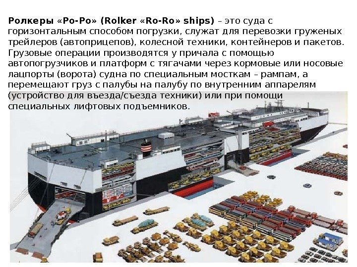 Ролкеры «Ро-Ро» (Rolker «Ro-Ro» ships) – это суда с горизонтальным способом погрузки, служат для перевозки груженых трейлеров (автоприцепов), колесной техники, контейнеров и пакетов. Грузовые операции производятся у причала с помощью автопогрузчиков и платформ с тягачами через кормовые или носовые лацпорты (ворота) судна по специальным мосткам – рампам, а перемещают груз с палубы на палубу по внутренним аппарелям (устройство для въезда/съезда техники) или при помощи специальных лифтовых подъемников.