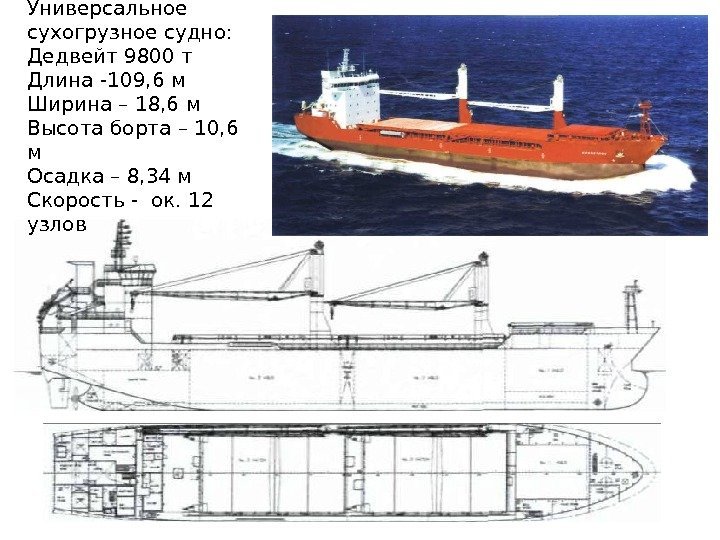 Универсальное сухогрузное судно: Дедвейт 9800 т Длина -109, 6 м Ширина – 18, 6 м Высота борта – 10, 6 м Осадка – 8, 34 м Скорость — ок. 12 узлов
