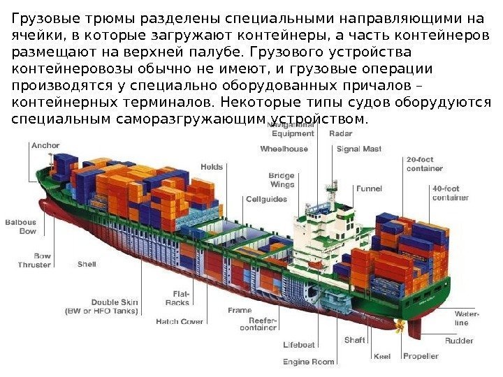 Грузовые трюмы разделены специальными направляющими на ячейки, в которые загружают контейнеры, а часть контейнеров размещают на верхней палубе. Грузового устройства контейнеровозы обычно не имеют, и грузовые операции производятся у специально оборудованных причалов – контейнерных терминалов. Некоторые типы судов оборудуются специальным саморазгружающим устройством.