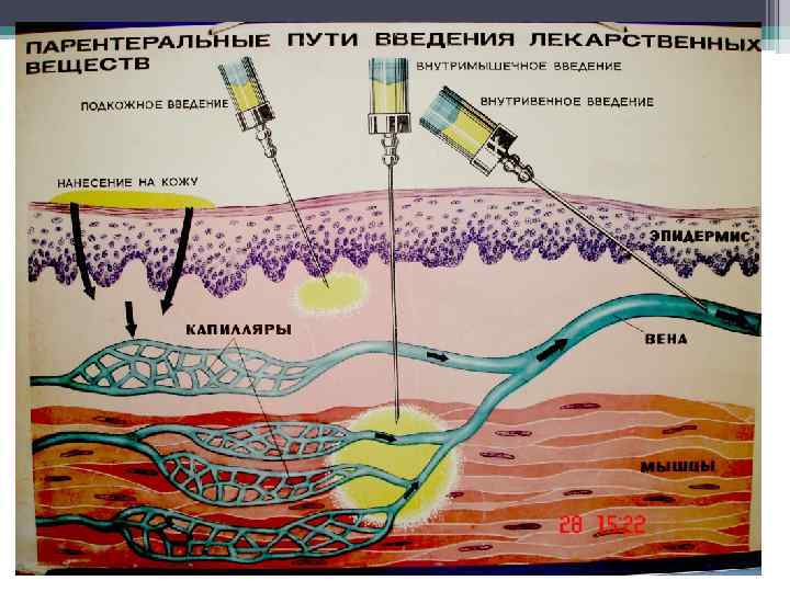 Классификация ЛФ в зависимости от способа введения : предложена В. А. Тихомировым ЭНТЕРАЛЬНЫЕ – формы, вводимые в организм через ЖКТ: через рот - пероральные, прямую кишку - ректальные; ПАРЕНТЕРАЛЬНЫЕ – формы, вводимые, минуя ЖКТ: -на кожу и слизистые оболочки организма; - инъекций в сосудистое русло (артерию, вену), под кожу или мышцу; - ингаляции. Путь введения определяет силу и скорость проявления действия ЛС Медицинское значение