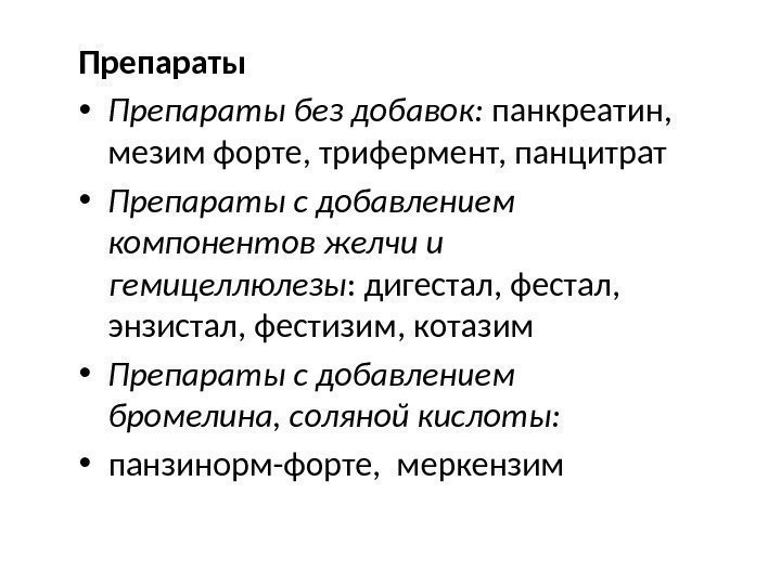 Препараты • Препараты без добавок: панкреатин, мезим форте, трифермент, панцитрат • Препараты с добавлением компонентов желчи и гемицеллюлезы : дигестал, фестал, энзистал, фестизим, котазим • Препараты с добавлением бромелина, соляной кислоты: • панзинорм-форте, меркензим