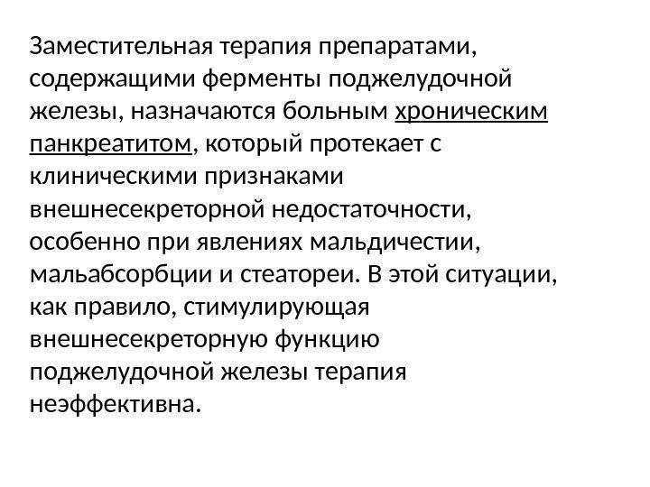 Заместительная терапия препаратами, содержащими ферменты поджелудочной железы, назначаются больным хроническим панкреатитом , который протекает с клиническими признаками внешнесекреторной недостаточности, особенно при явлениях мальдичестии, мальабсорбции и стеатореи. В этой ситуации, как правило, стимулирующая внешнесекреторную функцию поджелудочной железы терапия неэффективна.