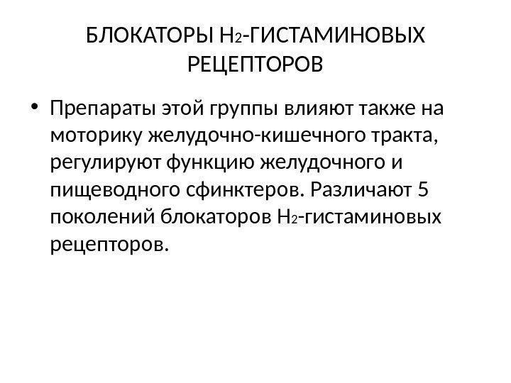 БЛОКАТОРЫ Н 2 -ГИСТАМИНОВЫХ РЕЦЕПТОРОВ • Препараты этой группы влияют также на моторику желудочно-кишечного тракта, регулируют функцию желудочного и пищеводного сфинктеров. Различают 5 поколений блокаторов Н 2 -гистаминовых рецепторов.