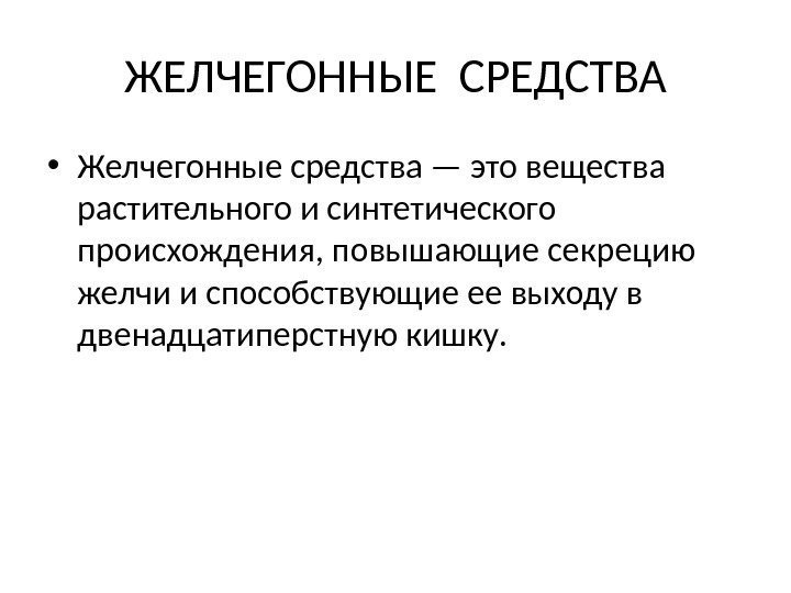 ЖЕЛЧЕГОННЫЕ СРЕДСТВА • Желчегонные средства — это вещества растительного и синтетического происхождения, повышающие секрецию желчи и способствующие ее выходу в двенадцатиперстную кишку.