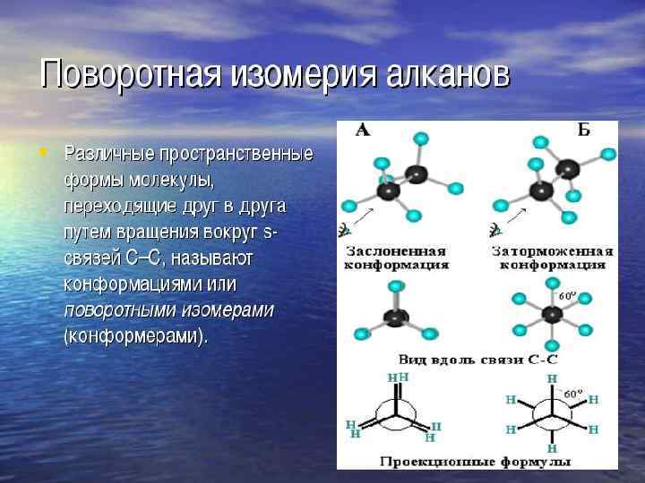• Если в молекулах одинакового состава и одинакового химического строения возможно различное взаимное расположение атомов в пространстве, то наблюдается пространственная изомерия (стереоизомерия). • В этом случае использование структурных формул недостаточно и следует применять модели молекул или специальные формулы стереохимические (пространственные) или проекционные. Алканы, начиная с этана H 3 C–СН 3, существуют в различных пространственных формах (конформациях), обусловленных внутримолекулярным вращением по s-связям С–С, и проявляют так называемую поворотную (конформационную) изомерию • Кроме того, при наличии в молекуле атома углерода, связанного с 4 -мя различными заместителями, возможен еще один вид пространственной изомерии, когда два стереоизомера относятся друг к другу как предмет и его зеркальное изображение (подобно тому, как левая рука относится к правой). Такие различия в строении молекул называют оптической изомерией.