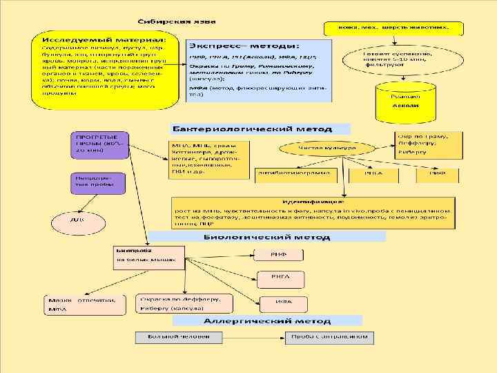 МЕТОДЫ ЛАБОРАТОРНОЙ ДИАГНОСТИКИ МИКРОСКОПИЧЕСКИЙ • БАКТЕРИОЛОГИЧЕСКИЙ • БИОЛОГИЧЕСКАЯ ПРОБА • АЛЛЕРГИЧЕСКИЙ (ПРОБА С АНТРАКСИНОМ): д ка ретроспективная, эпидем. исследование, отбор лиц для вакцинации. • СЕРОЛОГИЧЕСКИЕ: – РИФ, РЕАКЦИЯ ТЕРМОПРЕЦИПИТАЦИИ АСКОЛИ.