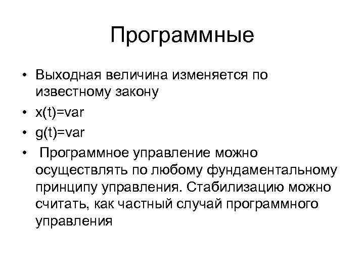 Программные • Выходная величина изменяется по известному закону • x(t)=var • g(t)=var • Программное управление можно осуществлять по любому фундаментальному принципу управления. Стабилизацию можно считать, как частный случай программного управления