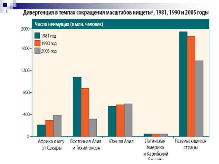 Нищета n n n Число неимущих, живущих менее чем на 1, 25 долл. США в день, по миру в целом сократилось с 1, 8 миллиарда человек в 1990 году до 1, 4 миллиарда человек в 2005 году, однако это сокращение практически полностью было достигнуто за счет Китая. В странах Африки к югу от Сахары и в Южной Азии число бедных в абсолютном выражении увеличилось. В то же время с начала 1980‑х годов практически во всех странах наблюдается усиление неравенства по доходам. Преодоление этой тенденции в глобальной экономической дивергенции, с тем чтобы не допустить превращения этого процесса в новый источник напряженности и незащищенности, станет одной из главных задач на предстоящие десятилетия.