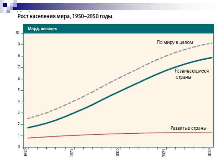 Демографическое неравенство n n В ближайшие десятилетия заметное влияние на усиление глобальной взаимозависимости будут оказывать демографические тенденции. Ежегодно население мира увеличивается более чем на 70 миллионов человек. Это означает, что к 2050 году мировая экономика должна быть в состоянии обеспечить достойную жизнь более чем 9 млрд. человек, 85 % которых будут проживать в развивающихся странах.