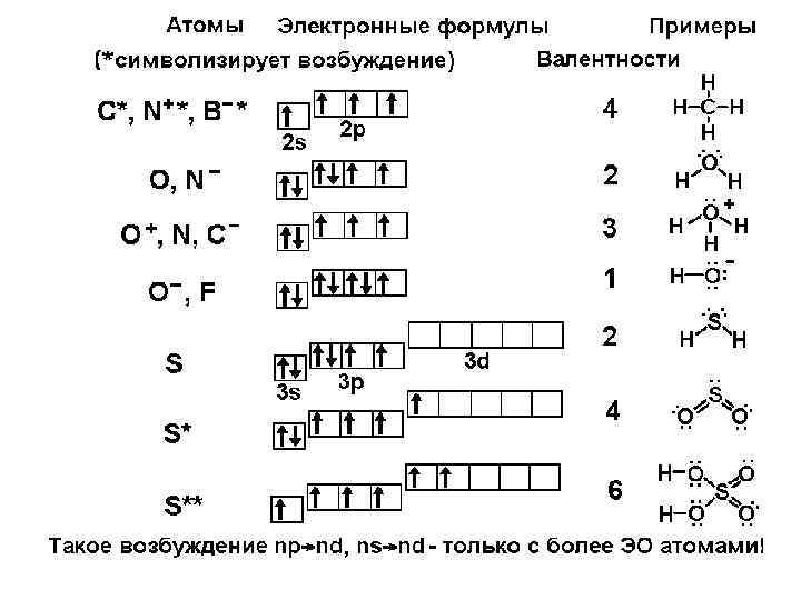 Теория отталкивания электронных пар валентного уровня (ОЭПВУ, VSEPR) Почти безошибочно предсказывает форму окружения атомов р-элементов при классической ковалентной связи. Но неприменима в неклассических, ионных и металлических структурах Для применения теории нужно сперва определить валентности атомов и нарисовать валентную схему с учётом неподелённых пар 1. Главное – общее число s–связей и неподелённых пар на внешнем уровне атома. Оно определяет форму его окружения (см. следующий слайд): 2 – линейная (180°), 3 – плоский треугольник (120°), 4 – тетраэдр (109, 5°), 5 – треугольная дипирамида (90° и 120°), 6 – октаэдр (90°). 2. Неподелённые пары отталкиваются сильнее поделённых, и под их влиянием валентные углы уменьшаются (если это не скомпенсировано таким же отталкиванием с другой стороны). 3. В треугольной дипирамиде неподелённые пары занимают экваториальные положения. 4. Кратные связи отталкиваются сильнее, чем простые, но слабее неподелённых пар 5. С уменьшением электроотрицательности центрального атома или увеличением электроотрицательности его соседей связывающие пары удаляются от центра, и их отталкивание ослабевает