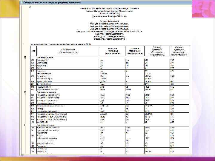 Общегосударственные классификаторы (ОК) 1. Классификаторы трудовых и природных ресурсов, например ОК профессий рабочих, должностей служащих и тарифных разрядов (ОКПДТР). 2. Классификаторы структуры отраслей (ОК отраслей народного хозяйства — ОКОНХ), органов управления (система обозначений органов государственного управления — СООГУ), административно-территориального деления (система обозначений административно-территориальных объектов — СОАТО), предприятий и организаций (ОКПО), форм собственности (ОКФС). 3. Классификаторы продукции (ОК промышленной и сельскохозяйственной продукции — ОКП, ОК строительной продукции). 4. Классификаторы технико-экономических показателей (ОКТЭП), управленческой документации (ОКУД), системы обозначений единиц измерения и др.